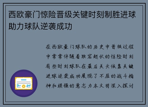• 西欧豪门惊险晋级关键时刻制胜进球助力球队逆袭成功